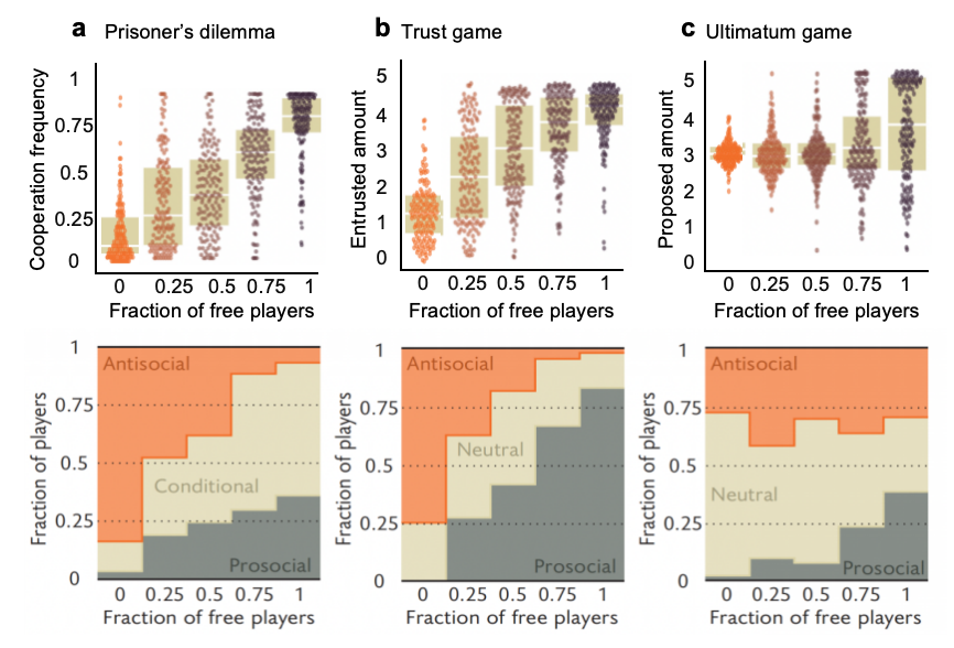 当今世界,广泛存在的博弈交互行为(合作、竞争、对抗等)已经成为各类系统稳定运行的基础。应运而生的博弈智能则通过对博弈关系的精准建模、求解、优化,进而形成决策知识库,成为助力国家人工智能战略和航空航天重大工程的重要基础理论。然而,现有研究难以充分解释大规模智能体、多元交互等复杂场景中合作涌现的内在机理和演化规律。针对这一挑战,永利yl23411王震教授团队研究了多元决策模式的大规模行为博弈,首次揭示了社交网络能动性(即增加网络中博弈智能体的决策自由度)可以显著激发群体合作、信任与公平等亲社会行为,为完善群体智能涌现理论提供了更充分的科学依据。最新研究成果以 Social networking agency and prosociality are inextricably linked in economic games 为题发表在Nature Human Behaviour 。