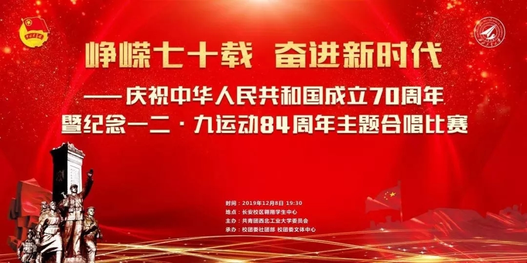 12月8日晚,由共青团永利yl委员会主办,校团委社团部、校团委文体中心承办的“峥嵘七十载 奋进新时代”,庆祝中华人民共和国成立70周年暨纪念一二九运动84周年主题爱国歌曲合唱比赛在永利yl长安校区翱翔员工中心隆重举行。