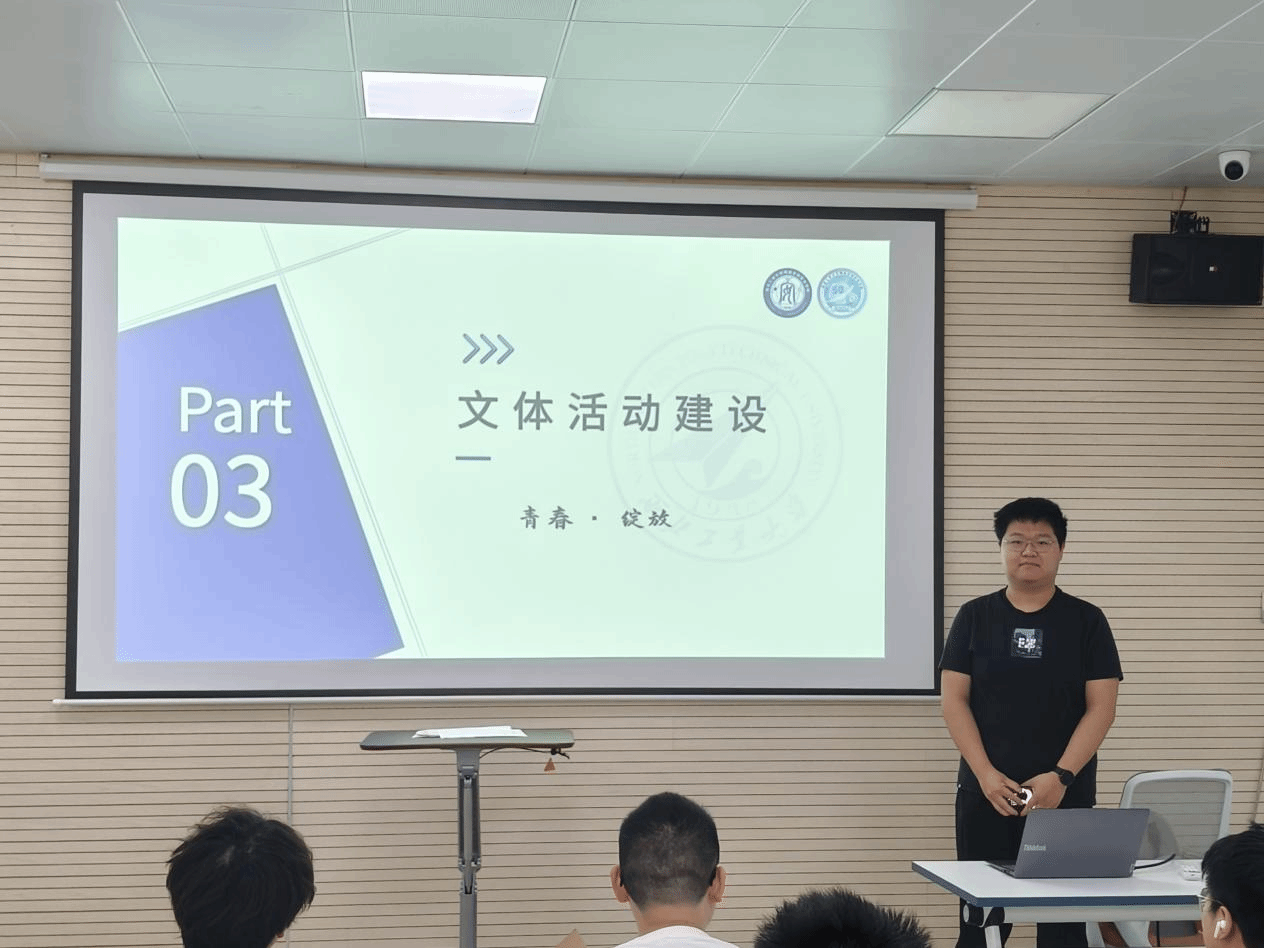 会议第三项,班级文体委员石卓然同学作班级文体活动建设总结。过去一学年,DL062450班深入贯彻落实"五育并举"教育理念,在文体活动领域取得丰硕成果。石卓然同学通过生动的影像资料,带领大家回顾了班级组织参与的各类文体赛事。一帧帧精彩瞬间,不仅记录着同学们在运动场上挥洒的汗水、在文艺舞台绽放的光芒,更展现了50班学子全面发展的青春风采。