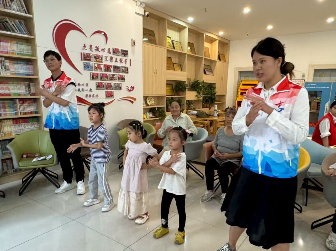志愿者们耐心分解每一个动作,从“爱祖国、爱人民”到“鲜艳的红领巾飘扬在前胸”,每一词句都配合着精准的手语动作。孩子们学得格外认真,在反复练习中,一双双小手渐渐舞动得整齐划一。铿锵有力的歌词配合优美的手语,爱国爱党的情怀在孩子们心中悄然生根发芽。