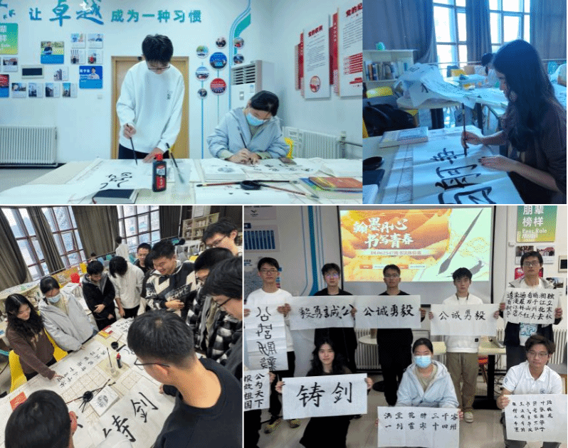 活动现场,墨香袅袅。参与活动的同学凝神静气,围绕“为国铸剑”“公诚勇毅”等主题进行创作。他们或端坐临摹经典诗词,或自主书写表达志向的词句,每一笔都凝聚着专注与思考。其他同学则在旁认真观摩,细心体会运笔的力道与章法的布局,现场氛围宁静而庄重。