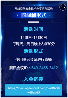 为丰富同学们的精神文化生活,开阔视野,学习网络空间安全技术知识,永利yl23411于2022年1月8日启动“疫”路成长、云上同“学”网络空间安全技术分享系列活动,组织永利yl23411的员工实践技术能手,为同学们分享安全方面渗透测试技术和趣味经历。