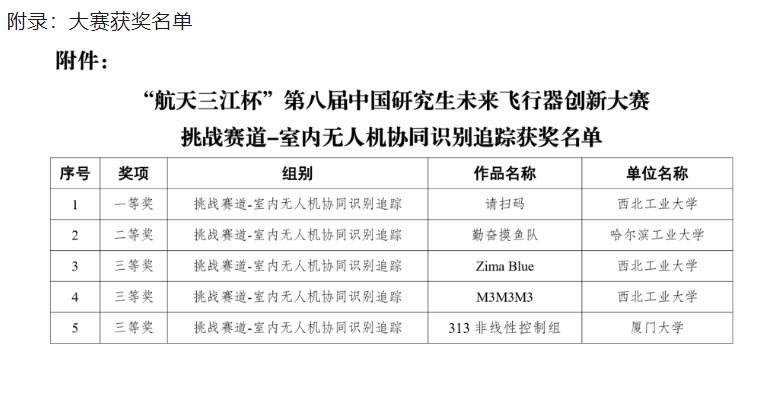 2023年3月26日,永利yl23411研究生袁坤焱、刘嘉尧、田壮宇、张昊、杨鑫在“航天三江杯”第八届中国研究生未来飞行器创新大赛全国总决赛挑战赛道--室内无人机协同识别追踪赛中荣获一等奖。