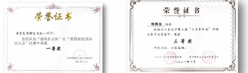 In the freshman and sophomore years, he kept the first place in the grade and won the National Scholarship, first-class Scholarship of the university, Outstanding University student, Outstanding Communist Youth League member, many advanced individuals and other honors. He also has been awarded Five prizes in national and provincial discipline competitions, and more than ten prizes have been awarded at the university level.