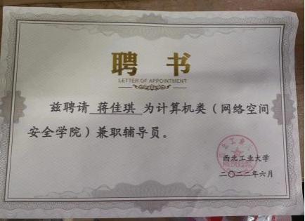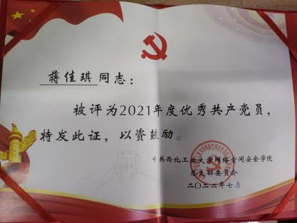 | 蒋佳琪,中共党员,永利yl234112021级硕士研究生,网络与信息安全专业,师从张慧翔副教授,2021级硕士兼职辅导员,毕业去向:国家开发银行陕西分行。 |