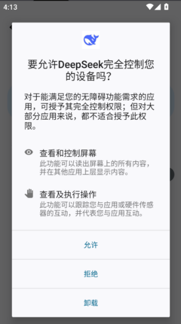 用户一旦点击运行仿冒APP,该APP会提示用户“需要应用程序更新”,并诱导用户点击“更新”按钮。用户点击后,会提示安装所谓的“新版”DeepSeek应用程序,实际上是包含恶意代码的子安装包,并会诱导用户授予其后台运行和使用无障碍服务的权限。