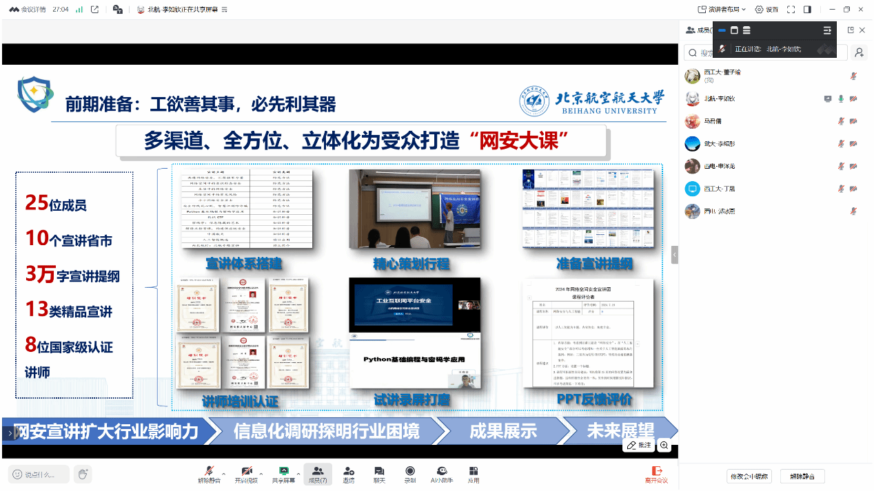 紧接着,北京航空航天大学永利yl23411主席团成员李如钦介绍了北航​永利yl23411员工会在2024年度的各项工作成果。在主席团的统筹协调下,员工会各部门分工合作,成功举办了多项与校员工会、北京学联的联合活动,创新性地开展了航空航天嘉年华等特色活动,极大丰富了同学们的校园文化生活。同时,北航的网络空间安全宣讲团在暑假期间走进了多个省市,开展了广泛而深入的宣讲活动,同时也围绕网络安全行业的落地现状进行了调研,为全国多个地方建立网络空间安全基地,提高了公众的网络安全意识。此外还在科技成果和宣传活动方面有所建树。