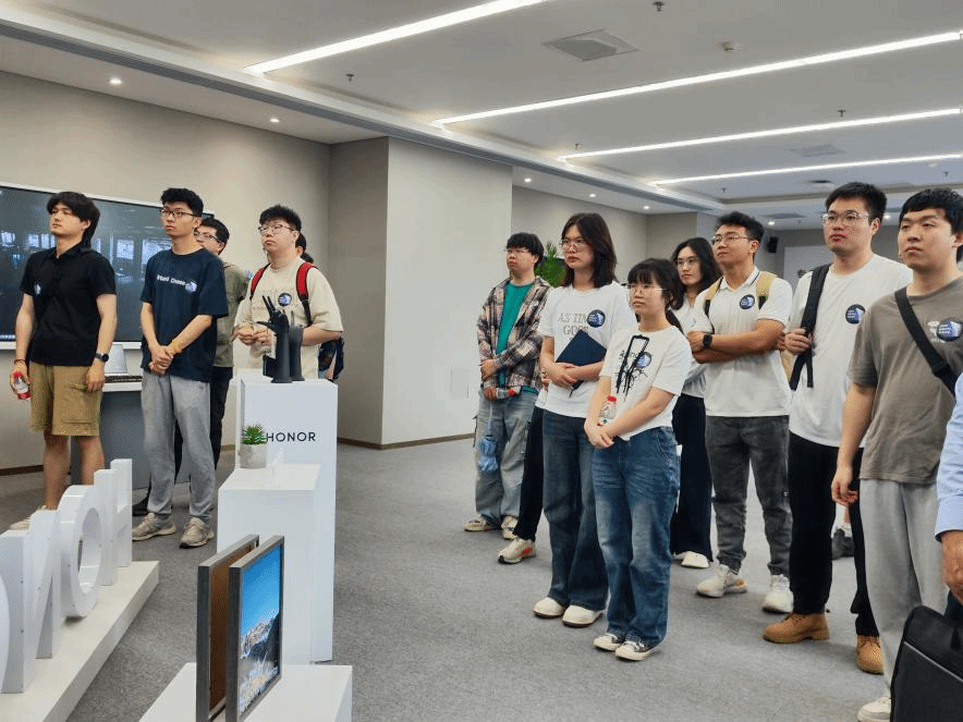 在荣耀公司人力资源总监与技术主管金珂宇的引导下,同学们首先参观了环境可靠性实验室,观察荣耀手机、电脑、平板等产品在极端环境下的稳定性与性能波动监测过程。从-40℃的极寒到85℃的高温,每一台设备都要经历数百小时的耐久测试,这种对品质的极致追求让同学们深受触动。随后深入参观全流程测试台、机械可靠性实验室、自动化测试实验室、天线实验室等专业设施区域,全方位感受荣耀对产品质量的严苛把控与极致追求。