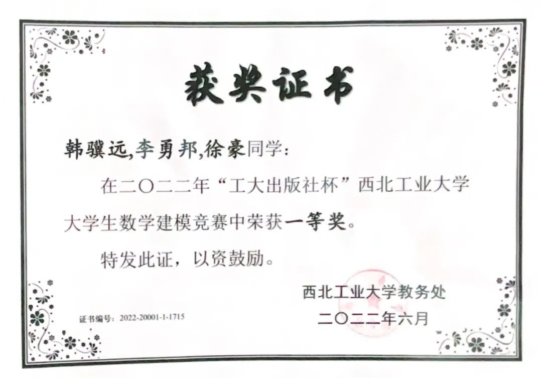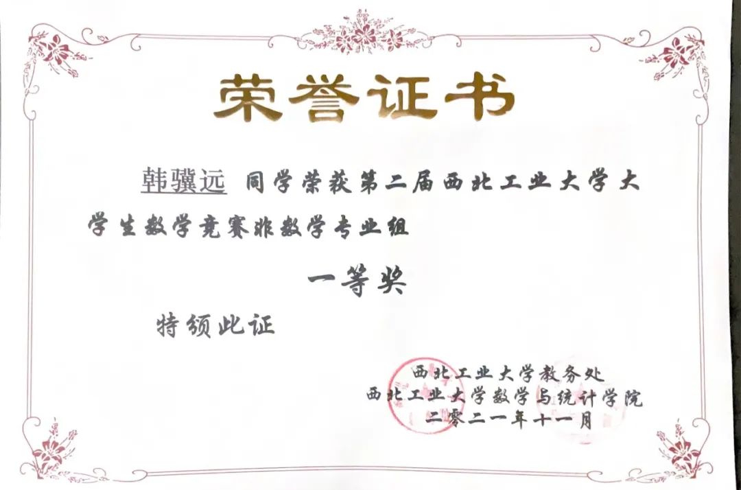 大一学年和大二学年学分积与综合测评均保持年级第一名,获得国家奖学金,校一等奖学金,优秀老员工,优秀共青团员,多项先进个人等荣誉。国家级、省级学科竞赛获奖五项,校级十余项。
