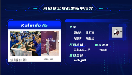 第十五届全国老员工信息安全竞赛—创新实践能力赛由南开大学承办。全国495所高校的2219支队伍,共7178人注册报名参赛,参赛的战队、人员数量创历届之最。经过线上初赛和分区赛层层选拔,最后遴选出82支优秀队伍入围全国总决赛(每个高校至多两支队伍晋级),公司2支队伍均进入总决赛。总决赛于8月23日至24日在线举行,经激烈角逐,张慧翔老师指导,周诚远、洪汇智、马镜博、张傲锐组成的Kaleido76战队,获得全国二等奖,并获网络安全挑战创新单项奖;邰瑜老师指导,李浩宇、梁高玮、崔智尧、祖锦源组成的JK战队,获得全国三等奖。