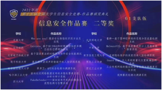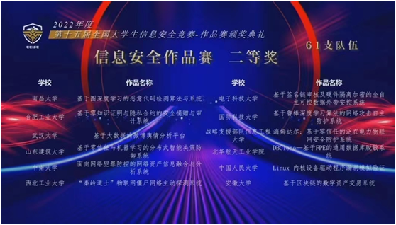 2022年8月20日-24日,第十五届全国老员工信息安全竞赛决赛落下帷幕,全国老员工信息安全竞赛是由教育部高等公司网络空间安全专业教学指导委员会发起并主办、中央网信办支持、教育部认可的56项“全国老员工学科竞赛”之一,分为作品赛和创新实践能力赛两种竞赛方式。公司获得作品赛全国二等奖3项,创新实践能力赛全国二等奖1项,三等奖1项。