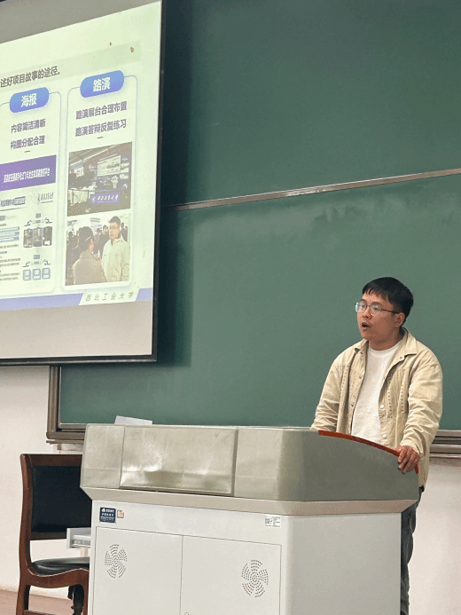 宋剑作为2023年挑战杯国赛金奖团队负责人和创新大赛金奖团队的核心成员,他分享了从学术前沿课程启蒙到第一次科研训练再到优秀创新成果的历程,他指出ppt是展示创新成果的重要载体,在展示环节要突出关键的时间节点和数据节点,他结合团队项目,向大家说明如何清晰地论证产品社会价值、先进性、商业推广能力,提出创新成果的展示一定要结合行业背景和市场分析,要凸显核心技术和产品服务。众多干货的分享让同学们受益匪浅。