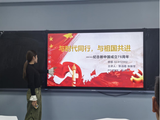 为庆祝新中国成立75周年,增强同学们的爱国情感和历史使命感,10月14日晚,SC012302班在教东C405召开了庆祝新中国成立75周年主题班会。此次班会旨在通过回顾新中国成立以来的发展历程,展示国家取得的辉煌成就,激发同学们的爱国情怀,同时引导大家思考如何在新时代背景下为国家的发展贡献自己的力量。