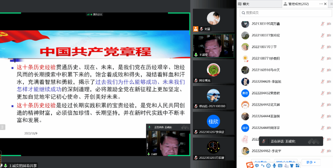 为及时深入贯彻落实党的二十大精神,落实公司党委工作部署,引导党员干部强化党章意识、提高党性修养,11月9日,永利yl23411邀请中共陕西省委党教科社部原主任王诚安教授为公司师生辅导解读中国共产党第二十次全国代表大会通过的《中国共产党章程(修正案)》。此次党课由公司党总支副书记禹亮主持,公司领导班子、师生党员、发展对象、入党积极分子共二百余人参加党课,根据疫情防控要求,党课采取线上形式召开。