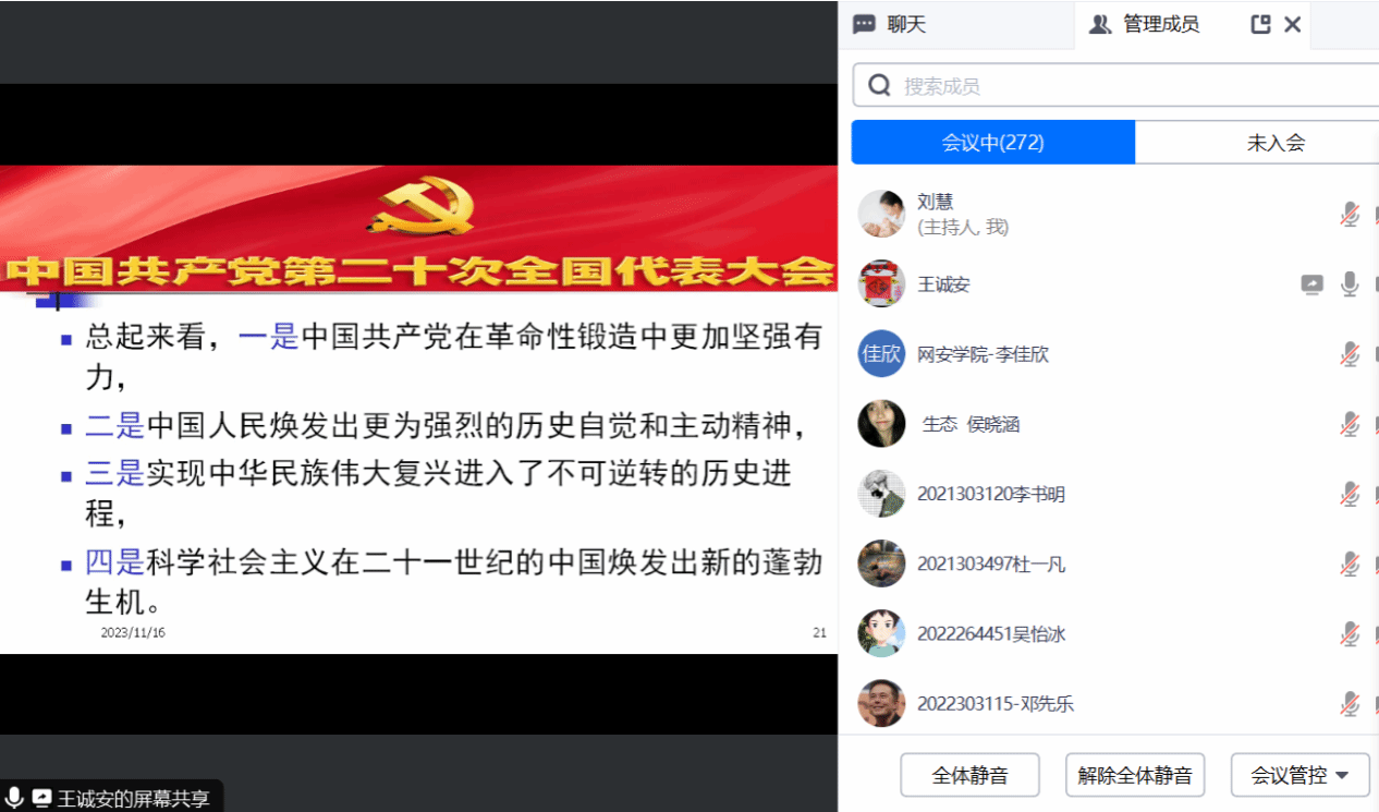 会议最后,王诚安教授以习近平总书记提出的“大道至简,实干为要”要求结束此次党课。同学们纷纷表示,通过本次学习,更加深入地了解了党的二十大精神,对于今后的工作和学习有了更清晰的方向和目标,将把自身发展融入党和国家的要求、时代发展的要求中去,为维护国家网络空间安全,实现国家富强、民族复兴贡献力量。